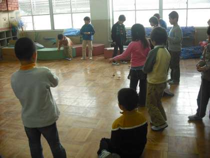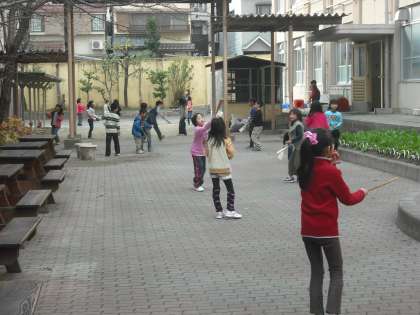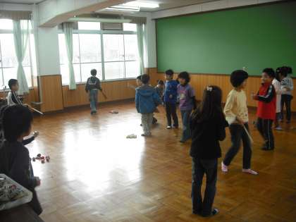 お正月に家族でそろって遊んだと思いますが,友だちと一緒に遊ぶのも格別です。羽子板やこま回し,お手玉などで楽しく遊んでいます。