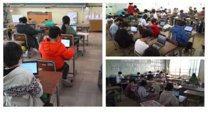 子どもたちはGIGA端末を持ち寄り、振り返りを打ち込んでいました。