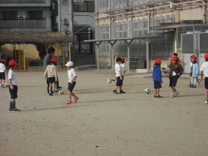 寒くてもみんな元気いっぱい。運動場でボールけりゲーム(サッカー)を楽しんでいます。手が使えないから,ちょっと苦戦中かな。