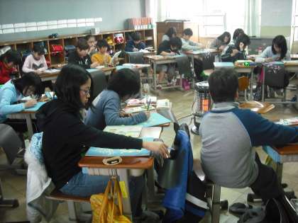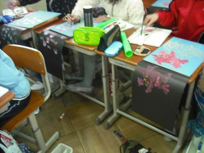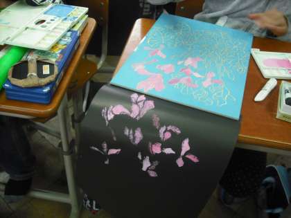 版木に採食して色刷りです。絵の具の濃さがポイントのようです。何度も何度も絵の具をつけて仕上げます。ずれないように気をつけてね。出来上がりが楽しみです。