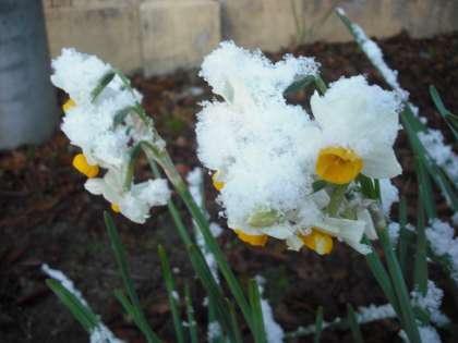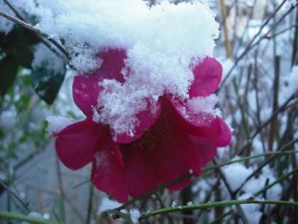 サザンカや水仙も雪をかぶっています。花にとって雪は大敵です。花びらがすぐに傷んでしまいます。