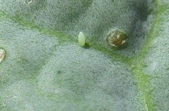 久しぶりに、仲よしの畑を見に行くと、残っていたキャベツの葉の裏に、何やら小さなタマゴらしきものが・・・。