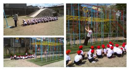 総合遊具では、三点支持をすることが大切です。事故のないようにお手本を見せて、ていねいに指導しています。
