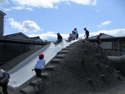 今日は、運動場の築山で、安全で楽しい使い方を確認しながらみんなで、登ったり滑ったりして楽しみました。
