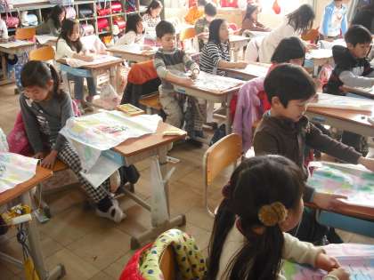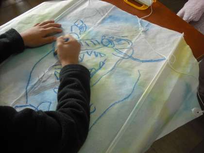 和紙を濡らして絵の具で下絵をしたぐにゃぐにゃ凧に竜の絵を描いています。いろんな竜がいます。できあがって,たくさんの竜が空を飛ぶのが楽しみだね。