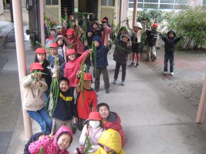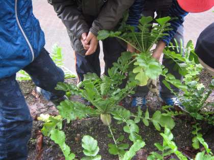 みんなで頑張って育てていた,大根とネギを収穫しました。大きく育っておいしそうです。みんな大喜びです。