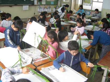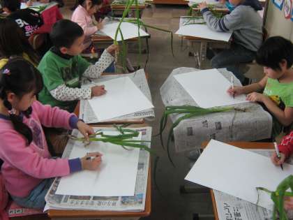 収穫した後,さっそく絵に描いています。細かいところまでよく見て描いています。ところで,収穫した大根やネギはどうなるのでしょう。