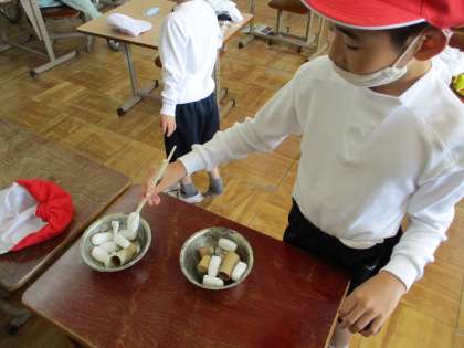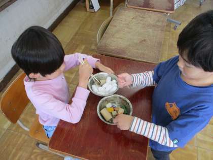授業と授業の合間、少し友だちを待っている間に、「わりばしでつまんで移し替えゲーム」にチャレンジする子どもたち。