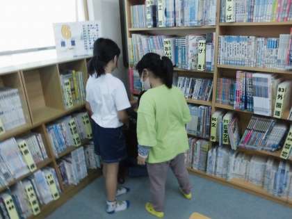 国語科の授業では、「図書館たんけん」の学習をしました。図書館司書の土田先生に、図書館にある本の分類を探検しながら教えてもらいました。