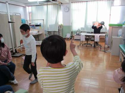 保健室で、養護教諭の先生からエプロンシアターでの検査の説明。