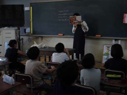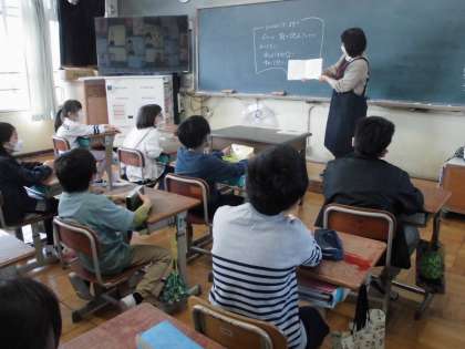図書館ボランティアの方が朝の読書タイムに本の読み聞かせに来てくださいました。
