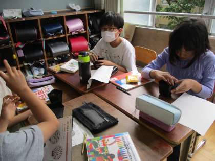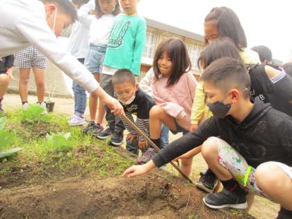前回に、種の形・大きさ・色などの特徴をカードにかいた子ども達。まちにまった種まきをしました。一人ひとりポットにホウセンカ、または大豆を選んでまきました。直植えに適したオクラ・ヒマワリは花壇に。芽が出ることを、大きく育つことを願いながら種まきを楽しんでいました。