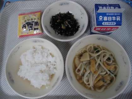 今日の「きつねカレーうどん」には、油あげをたくさん使っています。だしがしみ込んだ油あげ・かまぼこ・たまねぎ・細ねぎ・つるんとしたうどんをカレー味のだしとよくからめて食べました。