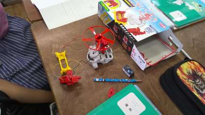 電池のはたらきについて学習しています。「電池の向きを変えるとプロペラが回る方向が変わるのか」などグループで協力して実験し、答えを導き出しています。