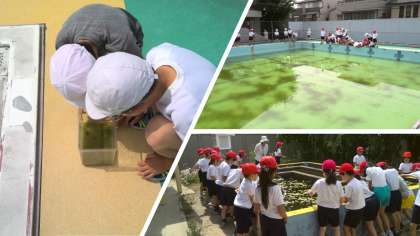 今日は、学校の敷地内を回り、水辺の生き物を探しました。
