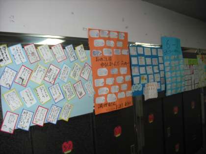 先週は給食週間でした。毎日いただいている給食について考え,給食にかかわっている人や食べ物に感謝の気持ちを持つことをねらいとしています。給食室のサービスホールには,各クラスからのメッセージが掲示されています。