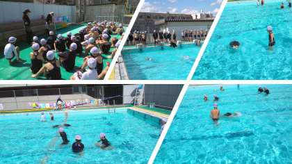 暖かい日差しの中、今年度初めての水泳学習を実施することができました。安全に水泳学習を進めるための注意点や、準備運動の仕方、学習の流れなどをおさらいした後、泳いだり、宝探しゲームをしたりして水に親しみました。来週より本格的に水泳の練習をしていきます。