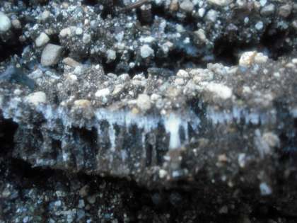 今朝も氷点下の朝,花壇には霜柱ができています。霜柱はまず地表の水分を含んだ土が凍ります。そこで,凍っていない地中の水分が毛細管現象で吸い上げられ,地表に来ると冷やされて凍ることを繰り返して,霜柱が成長するというものです。霜柱は地中の水分が凍ってできたものであり霜とは別の現象です。
