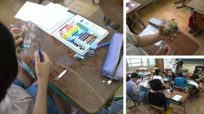 図工クラブでは、押し花をラミネートで加工して、すてきなかざりをつくっていました。