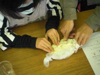おはようございます。今日は毎年吉例になっている,おやじの会主催の「うどん作り」が行われています。今年は22組の親子に参加していただきました。まずはじめに,うどん粉と食塩水を混ぜ,ダマができないように手で丁寧に練り合わせます。