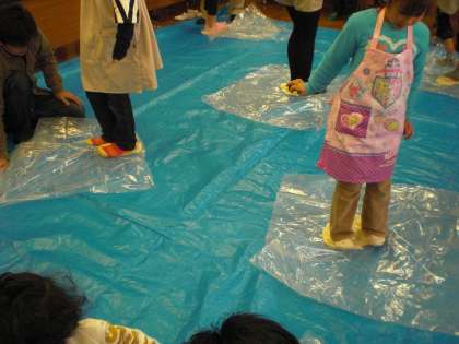 うどん粉を手で練った後,今度は足で踏んでさらに練ります。うどんのこしの具合はこの作業で決まります。何度も何度も親子で協力して頑張って踏んでいます。踏み終わったうどんは,この後しばらく寝かせます。