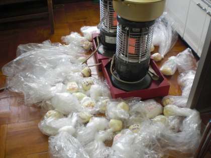 寝ているうどんたち ZZZZzzzz・・・・・・。足で踏み,しっかりとねられたうどん玉は,暖かいストーブの周りで寝かされます。この間,作業は少しひと休みです。
