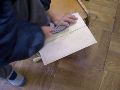 1枚の板から,無駄の出ないように工夫して,いろいろな形や用途を考え,切っていきます。楽しいものが出来上がりそうです。