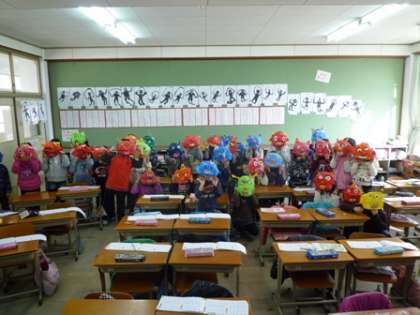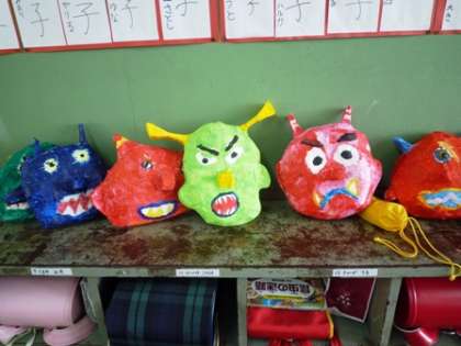 昨日までは真っ白だった鬼の面。そのお面に,今日,絵の具で色付けをしました。赤鬼,青鬼,黄色鬼,緑鬼。怖そうな鬼,可愛らしい鬼,優しそうな鬼。いろいろな鬼たちが教室にあらわれ,それぞれの鬼の表情を見ていると,とても楽しくなってきます。来週,最後にニスを塗って仕上げる予定です。