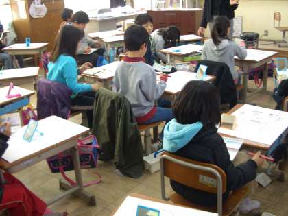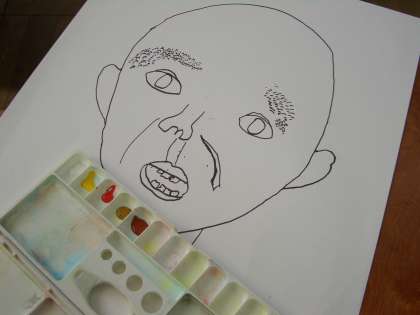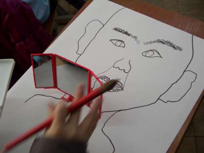 鏡を見ながら,自分の顔の特徴をつかんで絵に表わしています。下絵ができて,これから色を塗っていきます。どれくらい似てくるかな?