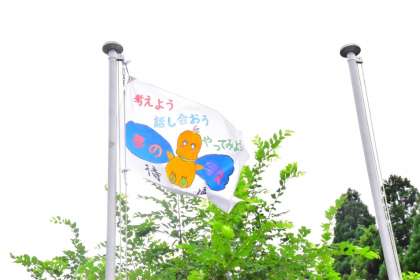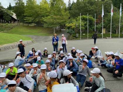 フライングディスクゴルフを終え,リンゴジュースで休憩です。