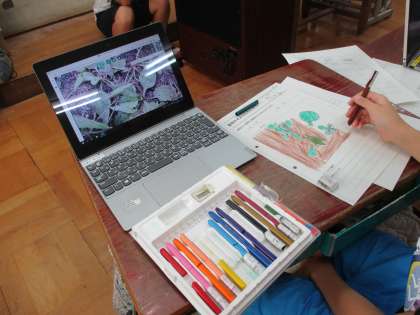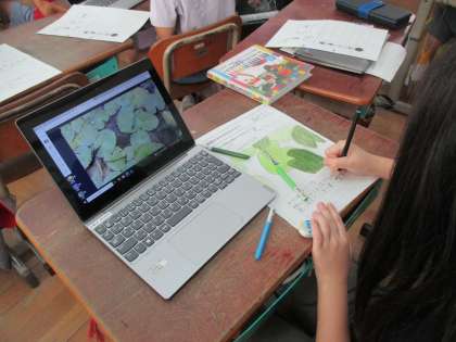 「昆虫などの動物は、どのような場所にいて、何をしているのか。」という問題を解決するために、運動場の周りを中心に観察し、見つけた動物をギガ端末で写真を撮りました。それを見ながら動物だけでなくその周りの様子を観察カードに書いて、グループを中心に交流しました。昆虫などの動物は、食べ物に関係のある場所やかくれることができる場所に多くいることを発見していました。