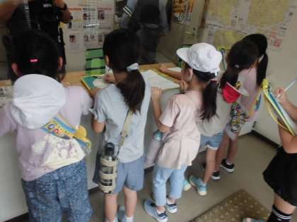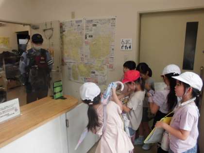 生活科「もっともっと町たんけん」では、小グループに分かれて探検に行きました。今日は、大徳寺交番で、おまわりさんにお話を聞きました。