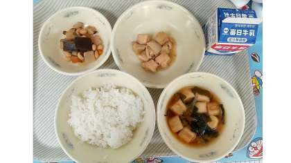給食の「五目煮豆」は、大豆とちくわ・にんじん・こんにゃく・こんぶを使って作っています。大豆のあま味やこんぶのうま味を味わいながら食べました。