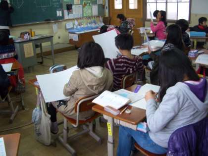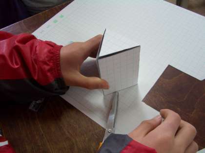 面と面のつながりに着目し,角柱の展開図を考えます。自力解決の場面で,実際に展開図を書き,組み立て,幾つかの三角柱の展開図を見比べ,共通点やきまりを話し合います。