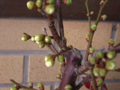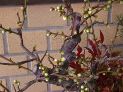正月用に作った松竹梅の盆栽の白梅,花芽が膨らんできました。部屋の中に入れておくと,とっくに咲いたのでしょうが,玄関に飾ったままなので,事前の状態なので,やっと花が咲く準備ができてきたようです。