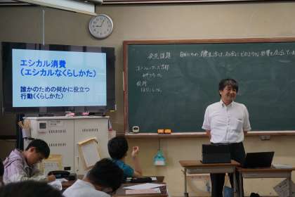 おおとりタイムでは、後期の新しい学習が始まりました。今日は、コンシューマーズ京都の方に話を聞き、自分たちの消費生活とその生活が及ぼす影響を知りました。「自分たちの消費生活がそんなところに影響するの!?」と初めてのことばかりで興味津々な様子でした。