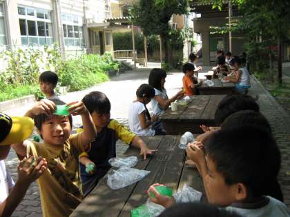 2年生の登校日は,まず最初に絵本「かぶと三十郎」の読み聞かせ,そのあと中庭へ出てスライム作りをしました。みんな上手に作って,ぷにょぷにょした感触を楽しんでいました。