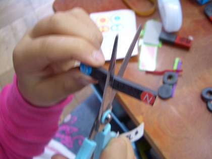 磁石の性質を利用したおもちゃづくりの過程で,ゴムの棒磁石を切ってみると,今まではつかなかった中央の部分が磁石になっていました。子どもたちの頭のは?????です。磁石っておもしろいですね。