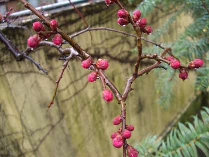昨日からの雨ですが,気温は上がっています。枝垂れ梅のつぼみも大きく膨らんできました。間もなく開花するでしょう。