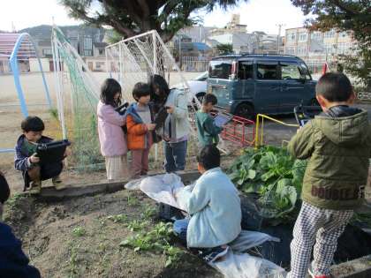 今、学級の畑では、白菜、大根、キャベツ、ほうれんそうを育てています。