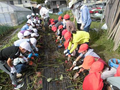 生活科「ぐんぐんそだておいしいやさい」の学習で、いつもお世話になっている地域の方の畑に行き、芋ほりをさせてもらいました。大きなお芋が、ゴロゴロと出てきて、子どもたちはとても喜んで、芋をほっていました。
