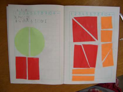 半分の大きさに関心をもち,正方形や長方形,円を折ったり切ったりして半分の大きさを作ります。作った半分の大きさを発表し,半分の大きさがいろいろな形で表せることや,半分の意味について学習します。