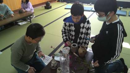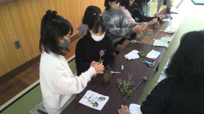 150周年式典や学習発表会に向けて、茶会を開く準備をしています。今日は、茶花を生けるお稽古を行いました。素敵な茶会を開くことができるように、茶花と対話しながら、角度や長さにもこだわりながら生けました。