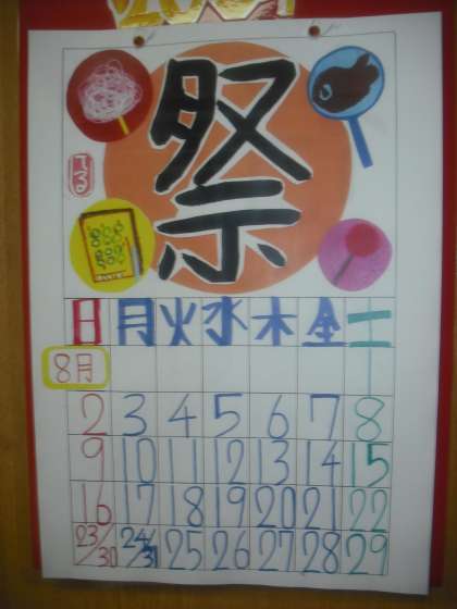 仲よし学級製作の8月のカレンダーです。夏まつりをイメージして作っています。8月22日の「待鳳まつり」が待ち遠しいですね。