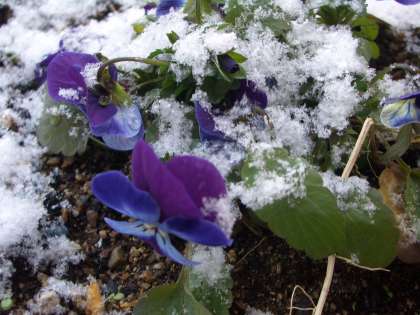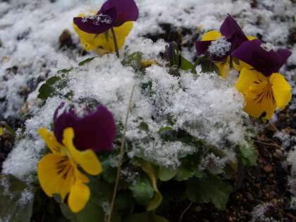 昨日ほどではありませんが,うっすら雪が積もっています。春はどこまで来ているのでしょう。パンジーやビオラも寒そうです。