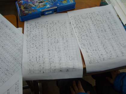 2年生では文集を作るために,1年間の学校生活で心に残っている出来事を集め「くわしいメモ」に書き出したことを基に,文章の組み立てを考え文章を書いています。