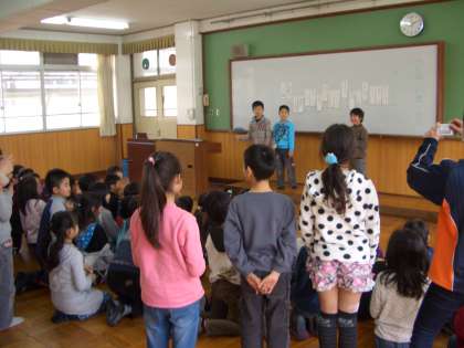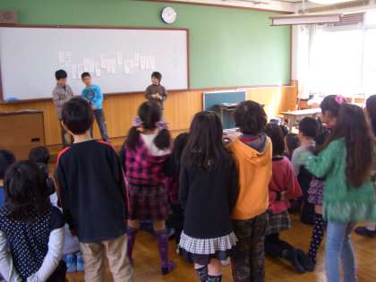 今日は学年のお楽しみ会です。自分の得意なことやできるようになったことを発表しています。みんな大盛り上がりです。