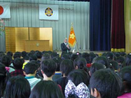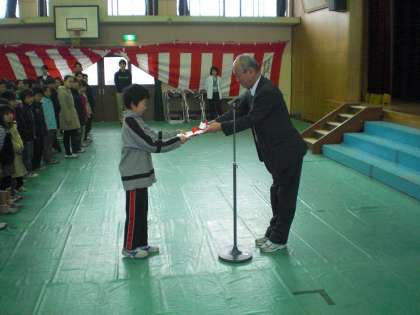 平成23年度の修了式が行われました。はじめに全校を代表して5年生に修了証が手渡されました。続いて校長先生から「新学期に向けて大きくジャンプできるように春休みに準備しておきましょう。」というお話がありました。式後,各教室で通知票が一人ひとりに手渡されます。進級おめでとうございます。一年間よく頑張りましたね。