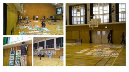 本日の放課後、教職員が体育館で、明日から始まる図工展の準備をしました。