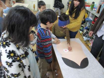 活動が始まると、みんなで作った福笑いをして笑ったり、ペットボトルボーリングや風船羽根つきをしたりして、一緒に楽しみました。
